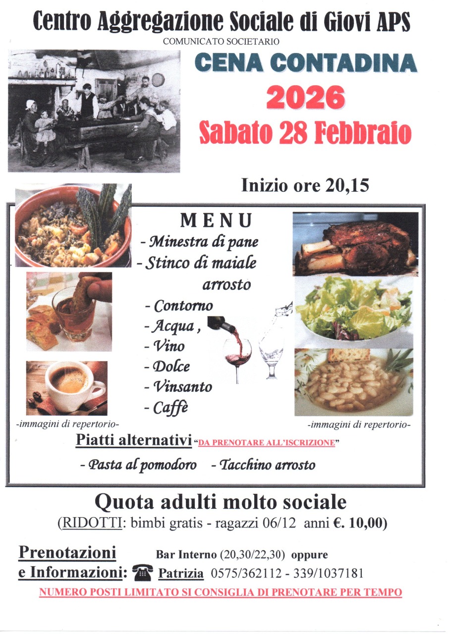 Sabato 28 Febbraio CENA CONTADINA 2026 - La Quota sociale adulti rimane fissata in €. 20,00 come nelle precedenti edizioni - Il numero dei posti in sala sarà predeterminato, si consiglia di prenotare per tempo per non rimanere esclusi.