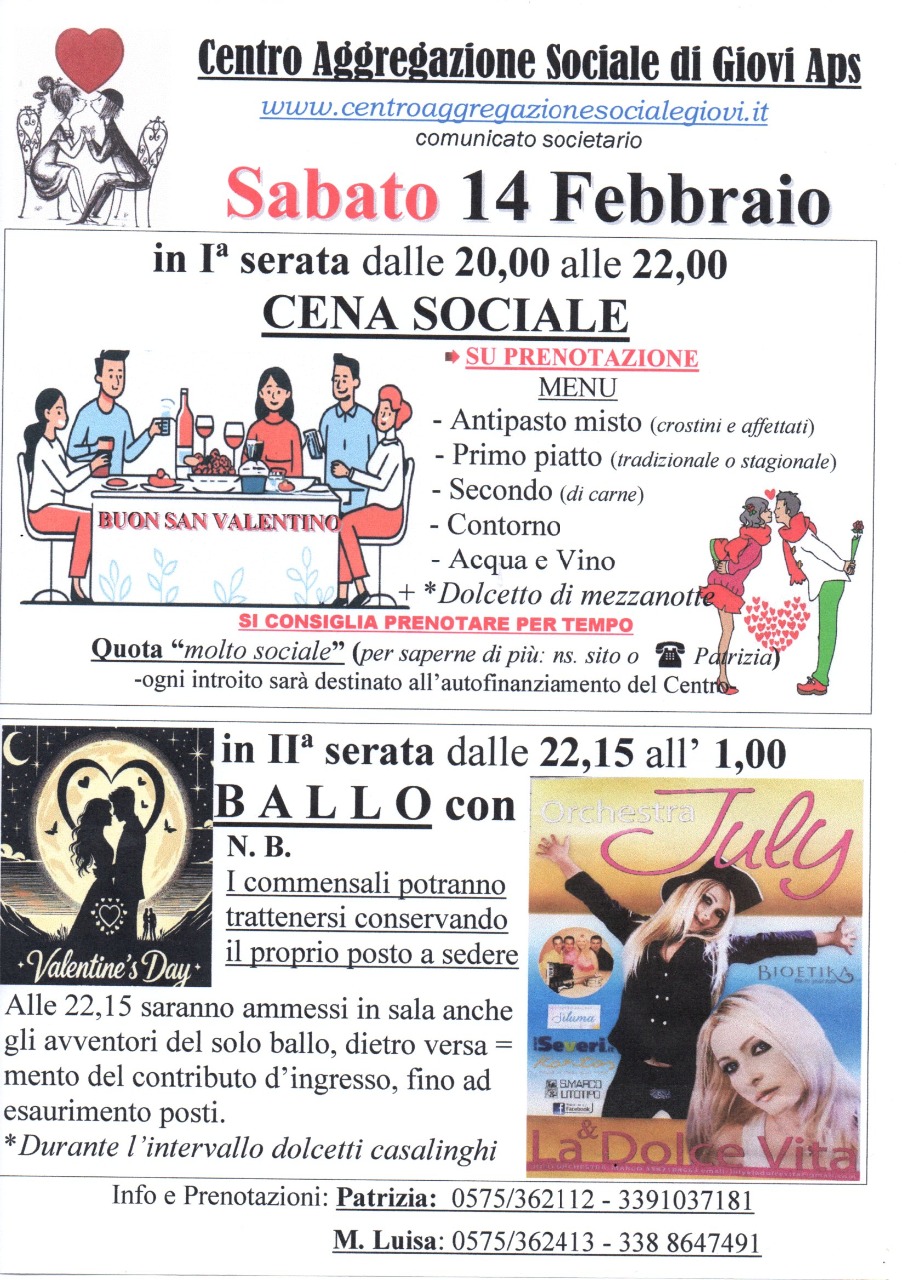 Sabato 14 Febbraio 2026 Cena e Ballo nella ricorrenza di San Valentino (segue locandina)