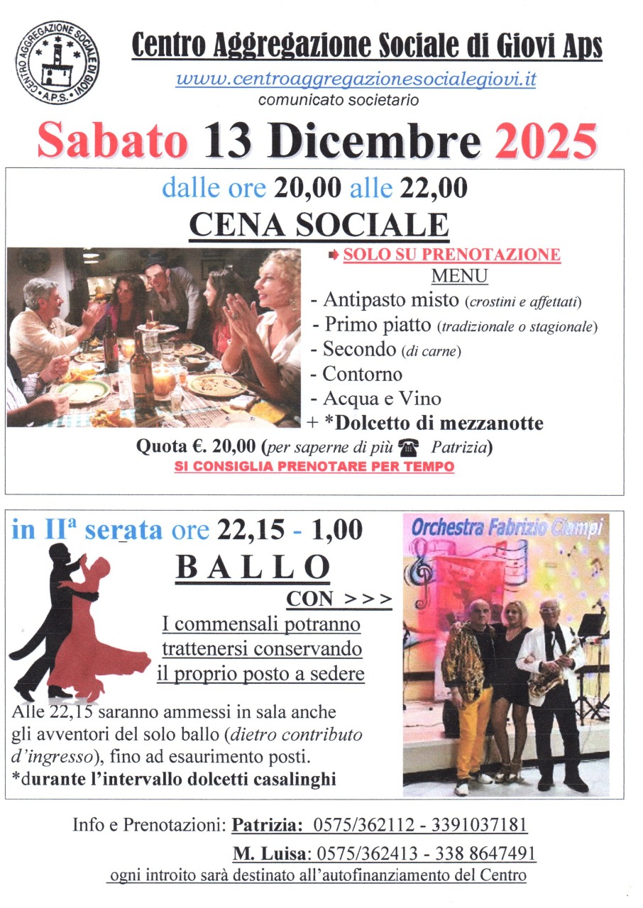 Il programma 2025/2026 di Cena sociale con Ballo è per il secondo sabato di ogni mese: di seguito le locandine dei prossimi appuntamenti - La quota di contributo sociale rimane fissata in €. 20,00 (tutto compreso) - ogni introito sarà destinato all'autofinanziamento del C.A.S. - La prenotazione alla cena è obbligatoria ad esaurimento posti - SI CONSIGLIA PRENOTARE PER TEMPO